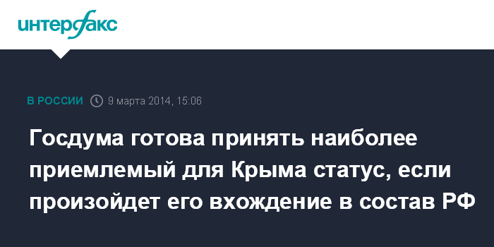 Москва. 9 марта. INTERFAX.RU - Депутаты Государственной думы Федерального собрания РФ готовы принять наиболее приемлемый для Крыма статус, если произойдет его вхождение в состав РФ.