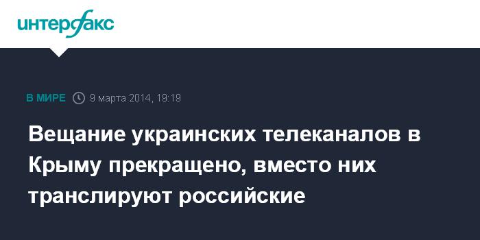 Москва. 9 марта. INTERFAX.RU - В Крыму полностью отключено аналоговое вещание всех украинских телеканалов. При этом на частотах некоторых из них ведется вещание российских телеканалов, передает корреспондент агентства "Интерфакс-Украина".