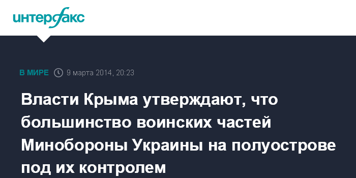 Москва. 9 марта. INTERFAX.RU - Большинство воинских частей Минобороны Украины, расположенных в Крыму, находится под контролем крымских властей, заявил журналистам глава Верховного Совета Крыма Владимир Константинов.