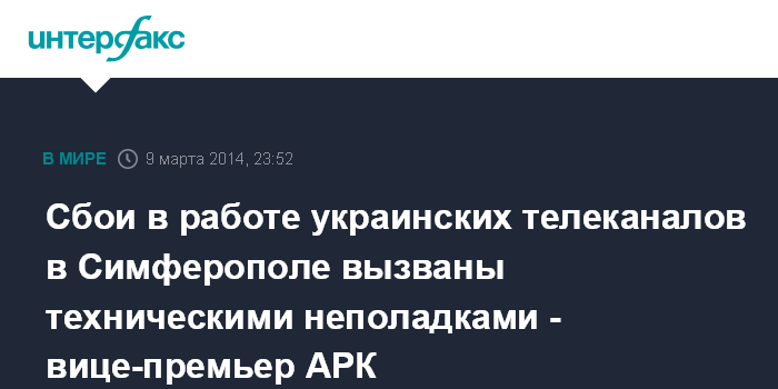 Симферополь. 9 марта. ИНТЕРФАКС - Возникшие в воскресенье сбои в трансляции украинских каналов в Симферополе вызваны техническими причинами, разъяснила "Интерфаксу" вице-премьер крымского правительства Ольга Ковитиди.