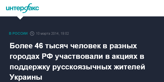 Москва. 10 марта. INTERFAX.RU - Несколько десятков тысяч человек в разных городах России приняли в понедельник участие в митингах в поддержку русскоговорящего народа Украины. Самые многочисленные акции прошли в Челябинске и Перми. В этих городах, по данным полиции, в митингах приняли участие по 15 тысяч человек.