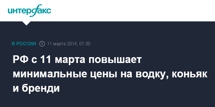 Москва. 11 марта. INTERFAX.RU - В РФ с 11 марта вступает в силу приказ Росалкогольрегулирования о новых минимальных ценах на водку, коньяк и бренди.
