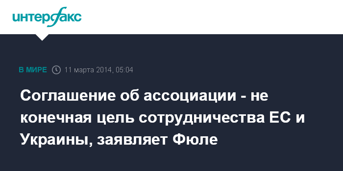 Москва. 11 марта. INTERFAX.RU - Верховный представитель ЕС по вопросам расширения и Европейской политики соседства Штефан Фюле заявил, что Соглашение об ассоциации не является конечной целью сотрудничества между Евросоюзом и Украиной.
