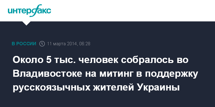 Москва. 11 марта. INTERFAX.RU - Митинг "Народный сход за Братский народ" в поддержку украинского народа и в защиту конституционных прав русскоязычного населения Украины прошел в понедельник на Корабельной набережной Владивостока.