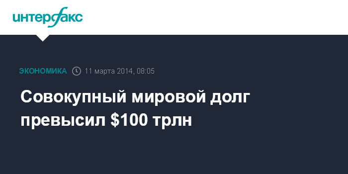 Москва. 11 марта. INTERFAX.RU - Совокупный объем долга в мире превысил $100 трлн, свидетельствуют данные Банка международных расчетов (БМР, англ. Bank for International Settlements, BIS), обнародованные в его ежеквартальном отчете.