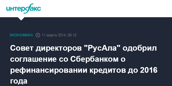 Москва. 11 марта. INTERFAX.RU - Совет директоров ОК "РусАл" одобрил договоренности со Сбербанком (MOEX: SBER) о рефинансировании кредитов до сентября 2016 года, говорится в сообщении компании.