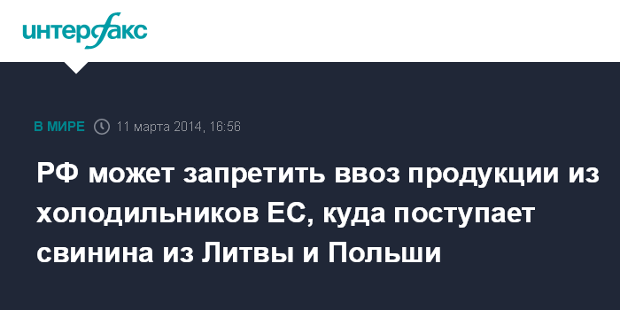 Москва. 11 марта. INTERFAX.RU - Россельхознадзор может запретить поставки всей продукции из холодильников Евросоюза, на которые поступает свинина из Литвы и Польши - стран, где зарегистрированы случаи африканской чумы свиней (АЧС).