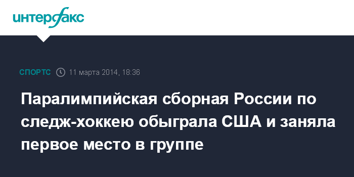 Москва. 11 марта. INTERFAX.RU - Сборная России по следж-хоккею одержала победу на Паралимпиаде в Сочи, обыграв в заключительном матче группового этапа сборную США со счетом 2:1 (1:0,1:0, 0:1)