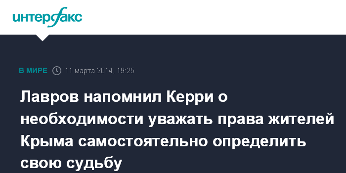 "Главы внешнеполитических ведомств обменялись мнениями о конкретных предложениях России и США по обеспечению гражданского мира и согласия в этой стране. С российской стороны особо подчеркивалась необходимость полного учета интересов всех украинцев и всех регионов в поиске выхода из кризиса, а также уважения права жителей Крыма самостоятельно определить свою судьбу в соответствии с нормами международного права", - сообщает сайт МИД РФ.