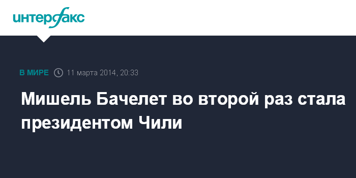 Мадрид. 11 марта. INTERFAX.RU - Мишель Бачелет - бывший кандидат на пост президента Чили от левой коалиции "Новое большинство" - приняла во вторник президентскую присягу на церемонии вступления в должность, сообщает агентство AP.