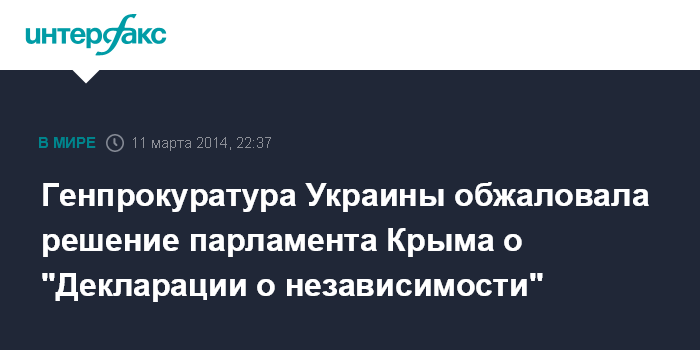 "Генеральная прокуратура Украины заявила в Окружной административный суд г. Киева требования об отмене принятых 11 марта 2014 Верховным Советом АР Крым и Севастопольским городским советом решений об утверждении "Декларации о независимости Автономной Республики Крым и г. Севастополя", которой предусмотрено по результатам назначенного на 16.03 .2014 республиканского референдума по вопросам территориальной принадлежности Крыма объявление Республики Крым независимым и суверенным государством и обращение к Российской Федерации с предложением о принятии Республики Крым в состав Российской Федерации в качестве нового субъекта", - говорится в сообщении пресс-службы.