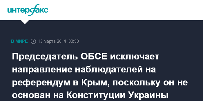 "Намеченный на 16 марта 2014 года референдум, касающийся Крыма, в его нынешнем виде противоречит украинской Конституции и должен рассматриваться как незаконный", - сказал председатель ОБСЕ, которого цитирует пресс-служба организации во вторник.