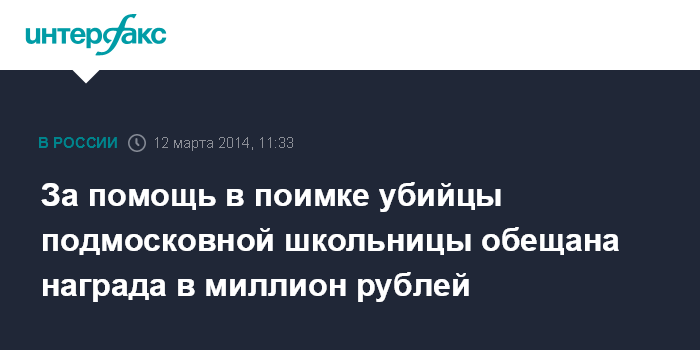 Москва. 12 марта. INTERFAX.RU - Следствие объявило вознаграждение в размере одного миллиона рублей за помощь в установлении личности убийцы 10-летней гимназистки в подмосковном городе Голицыно, сообщила официальный представитель областного главка СКР Ольга Врадий.