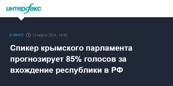Москва. 12 марта. INTERFAX.RU - Председатель верховного совета Крыма Владимир Константинов считает, что за вхождение в состав России могут проголосовать порядка 85% пришедших на избирательные участки.