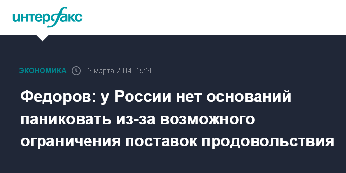 "Уровень защиты по продовольствию у нас достаточен для того, чтобы не паниковать и давать какие-то резкие оценки (в связи с возможным ограничением поставок продовольствия из-за рубежа - ИФ)", - заявил Федоров журналистам в среду.