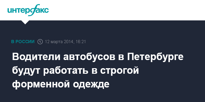 Санкт-Петербург. 12 марта. INTERFAX.RU - Более трех тысяч водителей автобусов в Петербурге будут работать в строгой форме к концу 2014 года, сообщили "Интерфаксу" в пресс-службе ГУП "Пассажиравтотранс" в среду.