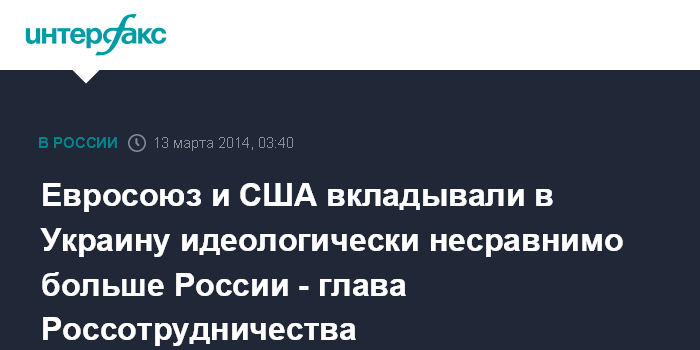 Евросоюз и США вкладывали в Украину идеологически несравнимо больше России - глава Россотрудничества