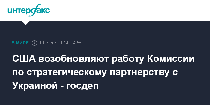 Брюссель. 13 марта. ИНТЕРФАКС-УКРАИНА - США возобновляют работу Комиссии по вопросам стратегического партнерства с Украиной, сообщает государственный департамент США по итогам визита премьер-министра Украины Арсения Яценюка, который состоялся в среду.