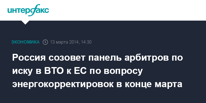 Москва. 13 марта. INTERFAX.RU -Россия созовет панель арбитров по иску в ВТО к ЕС по вопросу энергокорректировок в конце марта, заявил журналистам замминистра экономического развития России Алексей Лихачев в четверг в Москве.