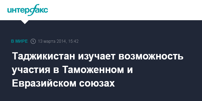 Душанбе. 13 марта. INTERFAX.RU - Таджикистан рассматривает возможность своего участия в Таможенном (ТС) и Евразийском экономическом союзах (ЕЭС), проявляя к этому большой интерес, заявила журналистам в четверг председатель Совета Федерации (СФ) Валентина Матвиенко после встречи с президентом республики Эмомали Рахмоном.