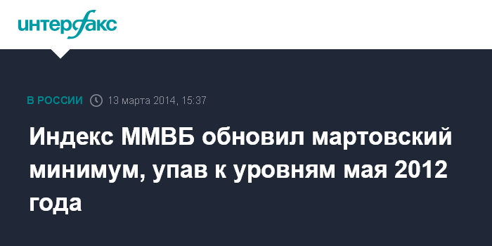 Москва. 13 марта. INTERFAX.RU - Индекс ММВБ, один из основных российских фондовых индикаторов, в четверг обновил мартовский минимум, упав к уровням мая 2012 года на новостях от Организации экономического сотрудничества и развития (ОЭСР).