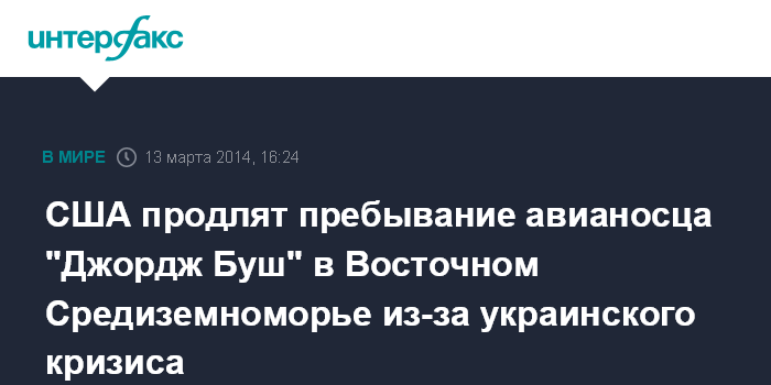 Вашингтон. 13 марта. INTERFAX.RU - Администрация Барака Обамы, как ожидается, в четверг объявит о плане Пентагона продлить пребывание авианосной ударной группы во главе с атомным авианосцем "Джордж Буш" в восточной части Средиземноморья в связи с событиями в Крыму, сообщает CNN со ссылкой на информированных американских представителей.