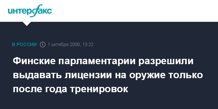 Москва. 1 октября. INTERFAX.RU - Финский парламент объявил об ужесточении правил получения лицензии на ношение личного оружия, сообщает во вторник британская телерадиовещательная корпорация BBC.