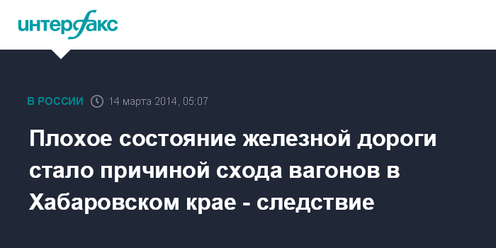 Москва. 14 марта. INTERFAX.RU - В Хабаровском крае в ходе доследственной проверки установлено, что причиной схода 19 вагонов грузового состава, который случился 5 марта в Комсомольском районе, стало нарушение технического содержания железнодорожного пути, сообщает пресс-служба Дальневосточного СУ на транспорте СКР РФ в пятницу.