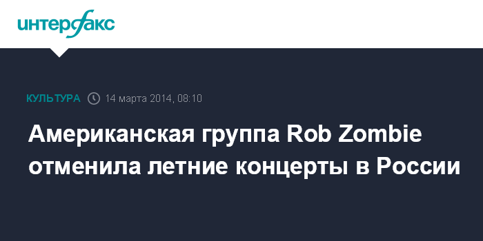 Москва. 14 марта. INTERFAX.RU - Американский музыкант Роб Зомби (Rob Zombie) и его одноименная метал-группа отменили свои июльские концерты в Москве и Санкт-Петербурге, сообщил организатор выступлений.