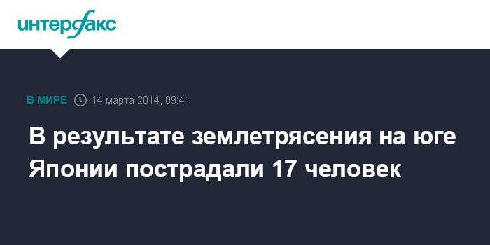 Москва. 14 марта. INTERFAX.RU - В результате землетрясения магнитудой 6,3, зафиксированного у северного побережья японского острова Кюсю на юге страны, пострадали 17 человек, сообщает японский телеканал NHK.