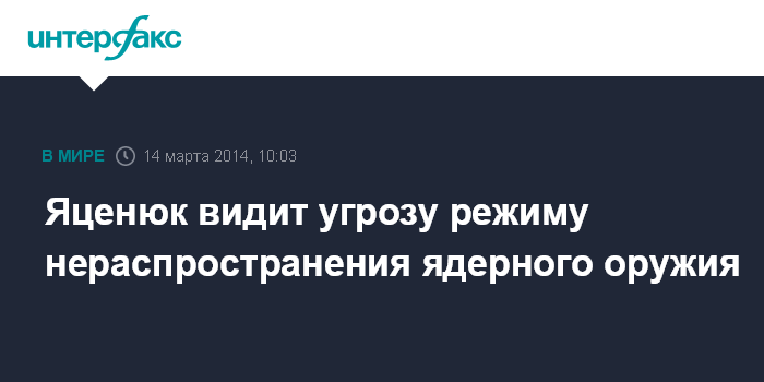 Москва. 14 марта. INTERFAX.RU - Глава временного кабинета министров Украины Арсений Яценюк заявил на заседании Совета Безопасности ООН, что режим нераспространения ядерного оружия может оказаться под угрозой, если его стране и России не удастся урегулировать кризис в двусторонних отношениях.