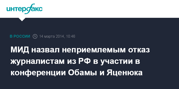 Москва. 14 марта. INTERFAX.RU - В Москве называют неприемлемым отказ пресс-службы Белого дома пропустить российских журналистов на пресс-конференцию 12 марта президента США Барака Обамы и главы нынешнего украинского правительства Арсения Яценюка.