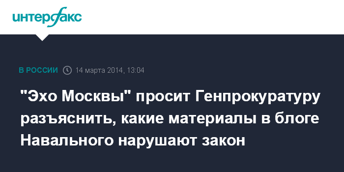 Москва. 14 марта. INTERFAX.RU - "Эхо Москвы" обратилось в Генпрокуратуру РФ с просьбой разъяснить, какие именно материалы в блоге оппозиционера Алексея Навального содержат незаконную информацию.