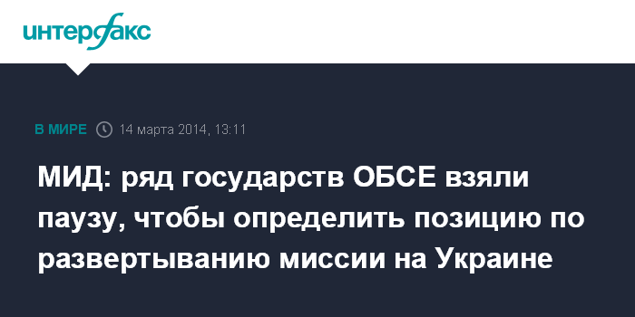 Москва. 14 марта. INTERFAX.RU - Российская сторона уже накануне была готова согласиться с развертыванием миссии ОБСЕ на Украине, но некоторые государства ОБСЕ пока не определились по этому вопросу.