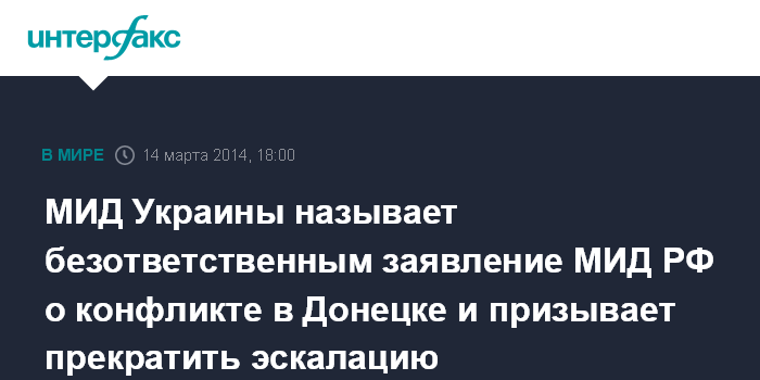 Москва. 14 марта. INTERFAX.RU - Министерство иностранных дел Украины считает безответственным заявление российского внешнеполитического ведомства относительно последних событий в Донецке.