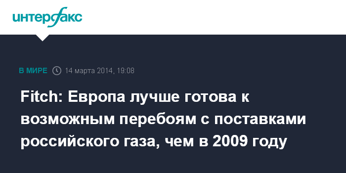 Москва. 14 марта. INTERFAX.RU - Европейские энергетические компании лучше готовы к временным перебоям с поставками природного газа из России через Украину, чем пять лет назад, полагают аналитики международного рейтингового агентства Fitch Ratings.