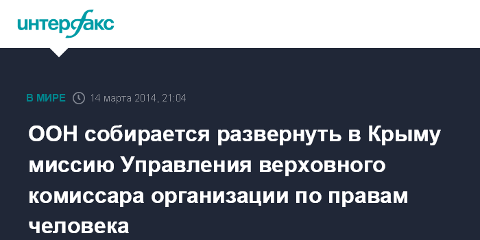 Москва. 14 марта. INTERFAX.RU - Помощник генсека ООН по правам человека Иван Шимонович подтвердил планы Организации Объединенных Наций о развертывании в Крыму миссии Управления Верховного комиссара ООН по правам человека.