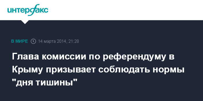 Москва. 14 марта. INTERFAX.RU - Глава комиссии по проведению общекрымского референдума Михаил Малышев просит СМИ и общественные организации соблюдать "день тишины".