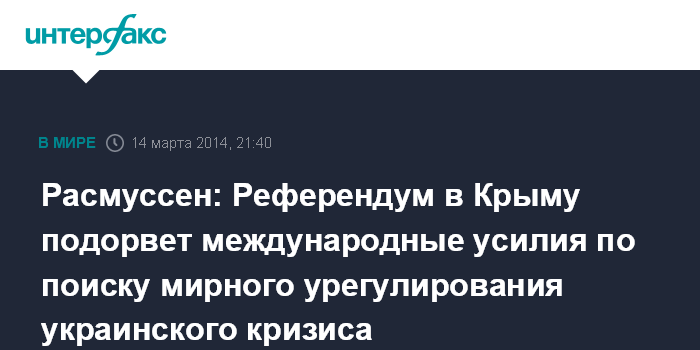 Расмуссен: Референдум в Крыму подорвет международные усилия по поиску мирного урегулирования украинского кризиса