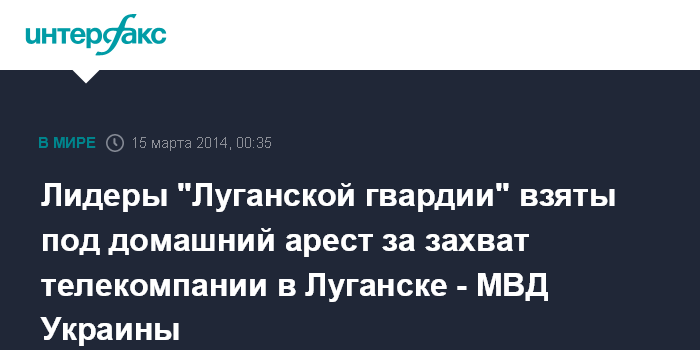 Киев. 15 марта. ИНТЕРФАКС-УКРАИНА - Двум лидерам организации "Луганская гвардия" за захват Луганской телерадиокомпании ИРТА, который произошел 10 марта, избрана мера пресечения в виде домашнего ареста, сообщил глава МВД Украины Арсен Аваков.