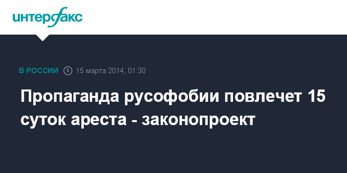 Согласно законопроекту, пропаганда русофобии в СМИ, а равно на публичных митингах, собраниях влечет наложение административного штрафа на граждан в размере от 1 тысячи до 2 тысяч рублей либо административный арест на срок до 15 суток. Для должностных лиц наказанием будет штраф от 1 тысячи до 4 тысяч рублей, для юридических лиц - от 10 тысяч до 50 тысяч рублей. Во всех случаях также предусматривается конфискация предмета административного правонарушения.