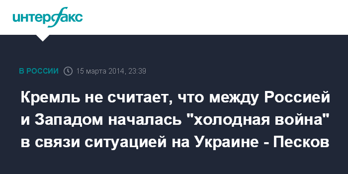 Москва. 15 марта. INTERFAX.RU - Пресс-секретарь президента РФ Дмитрий Песков заявил, что Кремль не считает, что между Россией и Западом началась "холодная война" в связи ситуацией на Украине.