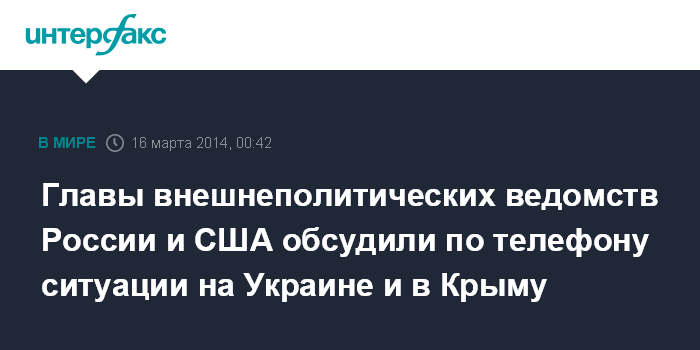 Москва. 16 марта. INTERFAX.RU - Министр иностранных дел РФ Сергей Лавров и госсекретарь США Джон Керри обсудили в телефонном разговоре ситуации на Украине и в Крыму, сообщается на странице МИД РФ в социальной сети "Фейсбук".