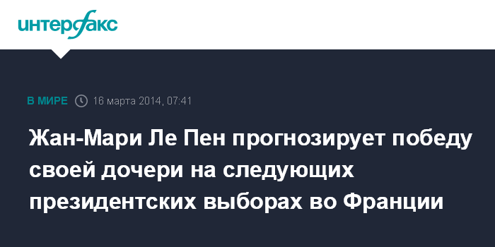 Париж. 16 марта. ИНТЕРФАКС - Основатель Национального фронта Жан-Мари Ле Пен заявил в субботу, что следующим президентом Франции станет в 2017 году его дочь Марин - нынешний лидер этой ультраправой партии.