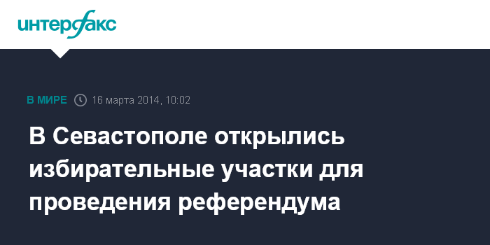 Москва. 16 марта. INTERFAX.RU - Более 190 избирательных участков открылись в 8:00 утра по местному времени в воскресенье в Севастополе, где проводится общекрымский референдум, на котором выносится вопрос о воссоединении с Россией.
