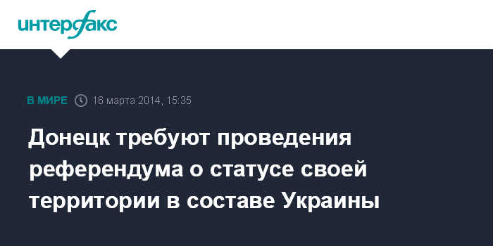 Москва. 16 марта. INTERFAX.RU - Митингующие в Донецке требуют провести референдум о статусе региона в составе Украины
