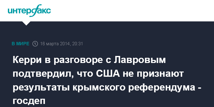 Вашингтон. 16 марта. INTERFAX.RU - Госсекретарь США Джон Керри в беседе с главой российского МИД Сергеем Лавровым подчеркнул, что Вашингтон не будет признавать исход референдума о статусе Крыма, сообщил госдепартамент.
