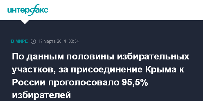 Москва. 17 марта. INTERFAX.RU - По данным, полученным с половины избирательных участков, за присоединение Крыма к России в качестве субъекта Федерации проголосовало 95,5% избирателей.