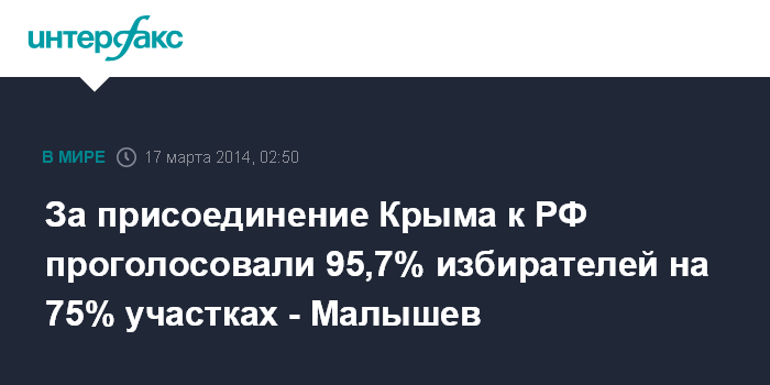 «Все 100% бюллетеней подсчитаны на трех четвертях избирательных участков. За присоединение Крыма к России высказались 95,7% избирателей», - сказал М.Малышев.