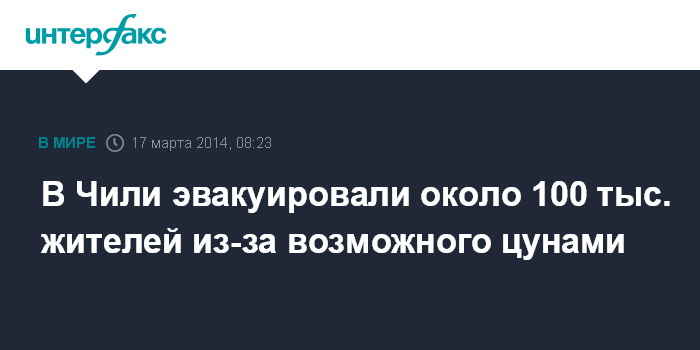 Москва. 17 марта. INTERFAX.RU - Власти в Чили сообщают об эвакуации 100 тыс. человек после сильного землетрясения, произошедшего в северной части страны, сообщает британская телерадиовещательная корпорация BBC.